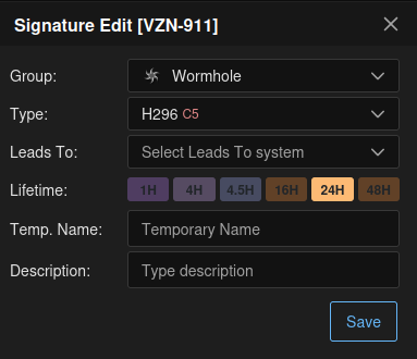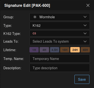 7. Important Quality of Life Step added with Wanderer. Double click the Wormhole in the Signature list on Wanderer, and set the Type. If it's K162 try to identify which class it goes to too, otherwise leave "K162 Type" blank. Also set lifetime if it's 4h or 1h.